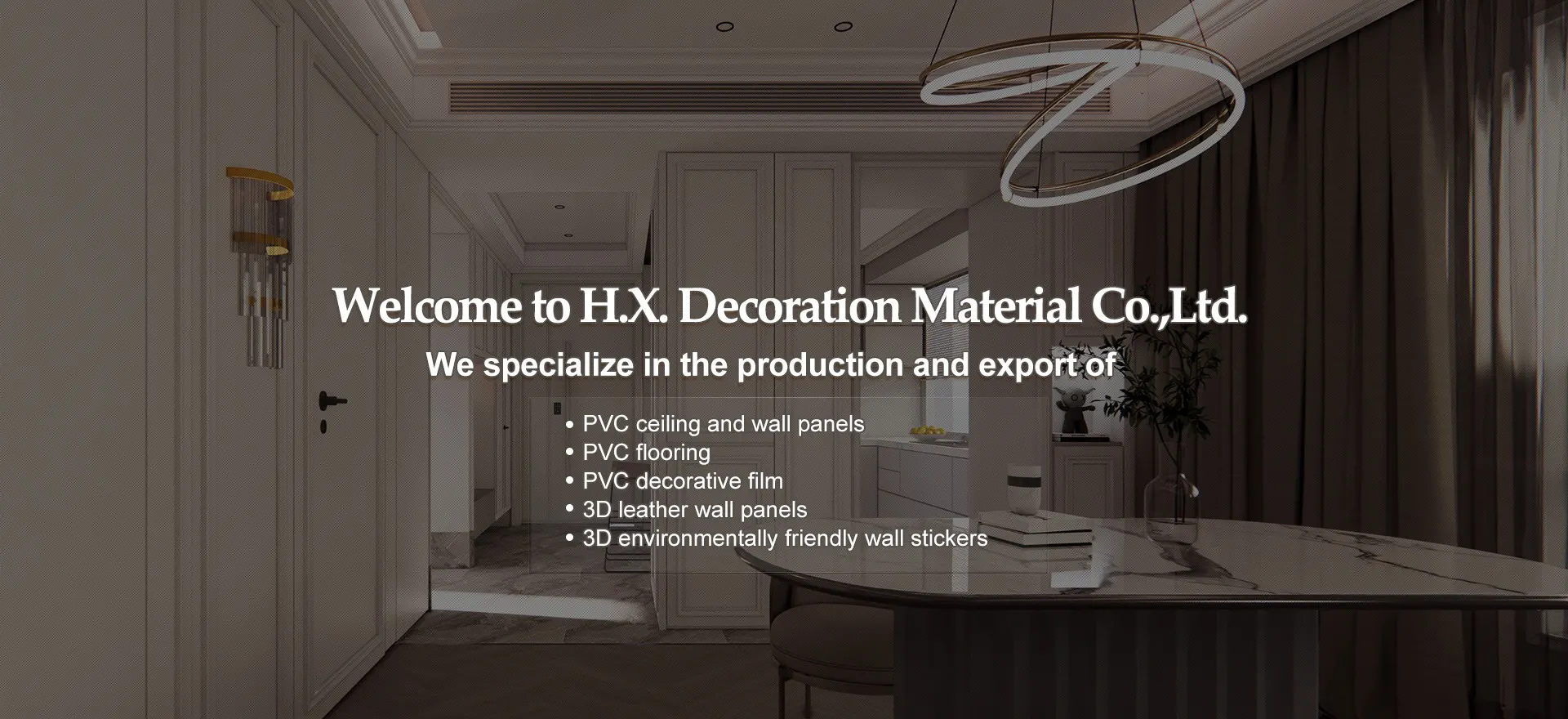 Haining Xinhuang Decoration Material Co ,Ltd. is a professional manufacturer GROUP and exporter for PVC panels for ceiling and wall ,PVC Floor, PVC decoration Film, 3D Leather wall panels, and 3D Wall sticker which accord with environmental protection.Our company is located in Haining City,Zhejiang province.There are 60 kilometers away from Hangzhou city and 120 kilometers away from the Metropolitan city--Shanghai, the transportation is very convenient.Our company owned the advanced production lines from Germany and Italy, our products have obvious advantages in high-intensity, rot proof, fireproof, damp proof, impact resistance, sound resistance, easy installation, and easy maintanance and so on. It can be used over 30 years without aging or fading and has a wide range applicable to all types of hotels,office bulidings,hospitals,schools,industrial plants,commercial buildings,restaurants and residential homes such as interior decoration.Our products can be satisfied with the requests of customers.All kinds of types,patterns&the colors we have developed are leading the fashion in Chinese decoration field.Our products can be found all over the world like Europe,Middle East,Asia,South America and Africa.